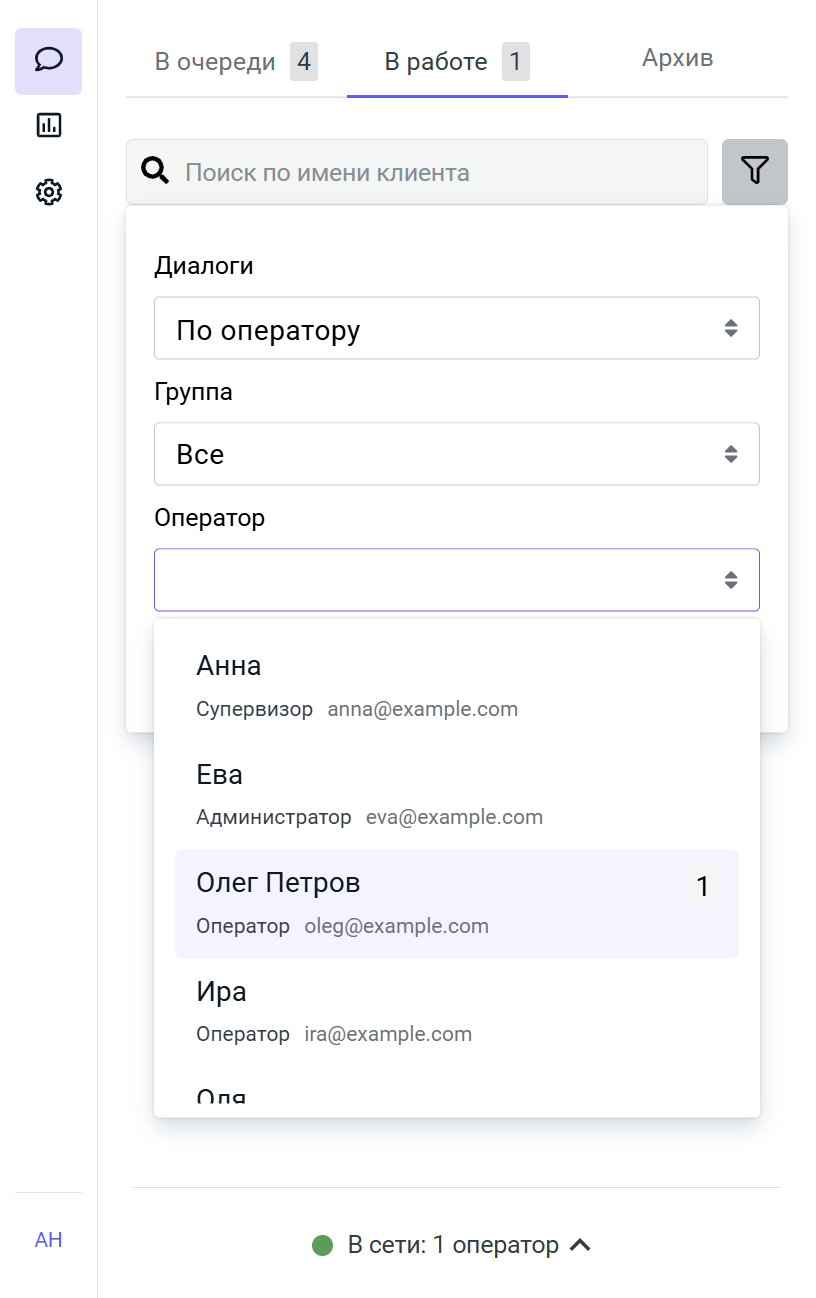 Также супервизор может отслеживать количество диалогов «В работе» у каждого оператора:
