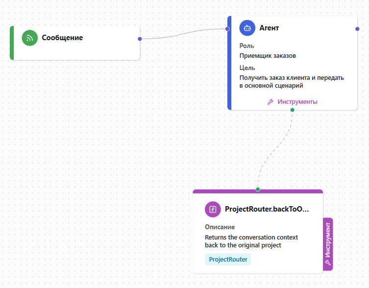 Подключим к агенту в качестве инструмента функцию ProjectRouter.backToOriginalProject() с параметрами: